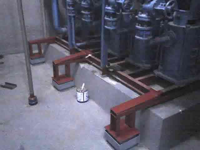 3)機(jī)組振動噪聲治理:水泵運行中由機(jī)組振動引起的,是一個技術(shù)難點,將振動源與承載物或地基之間的剛性連接,改為彈性連接,利用彈性裝置的隔振作用,減弱振動源與承載物或地基之間的能量傳遞,降低振動對環(huán)境的影響并通過基座傳播的固體聲污染是治理中的主要問題,只有針對結(jié)癥所在,認(rèn)真計算,合理使用水泵機(jī)組專用復(fù)合隔振臺,才能達(dá)到治理目的。