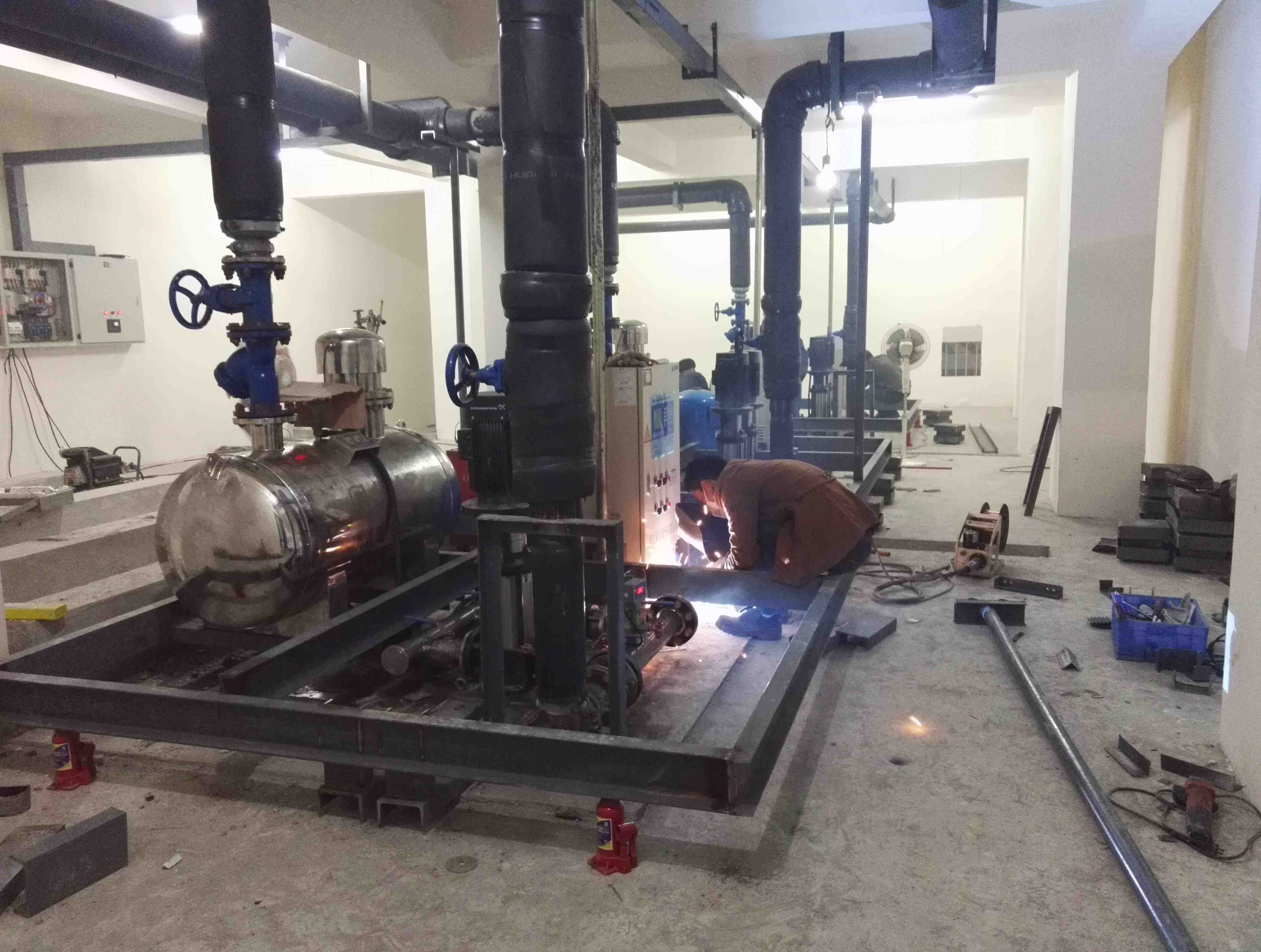 噪聲產(chǎn)生原因:我們認(rèn)為水泵基礎(chǔ)沒有進(jìn)行精確減振、管道沒有進(jìn)行軟連接和減振處理,水泵機(jī)組的低頻振動(dòng)沿著樓板、柱頭、墻壁向樓上傳播,導(dǎo)致樓上樓業(yè)主房間墻壁、地板、天花板、柱頭振動(dòng)明顯,房間內(nèi)低頻噪聲嗡鳴聲非常嚴(yán)重,雖然A聲級(jí)測(cè)量為39分貝,好像超標(biāo)不是太多(標(biāo)準(zhǔn)為35分貝),此類噪聲頻率低,分貝數(shù)不高,但對(duì)人體影響較大,由于噪聲的頻率集中在150-500赫茲,對(duì)人體大腦產(chǎn)生大量的@電波,引起人體煩惱度增大。水壓管道水流聲共振、水箱進(jìn)水脈沖等噪聲是影響樓上業(yè)主家里聲環(huán)境的主要因素,為此我們確定我們的施工方案與降噪目標(biāo)。